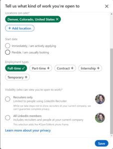 That said, there are times you don’t want your search to be public knowledge. But don’t worry, you can customize who can see that you’re looking! Click the “open to” button on your profile, and then select the “finding a new job” option. Toward the bottom of the screen, you’ll see this set of choices: